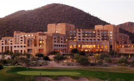 JW Marriott Tucson Starr Pass Resort & Spa blends into the desert by a skillful use of color, and actually brings the landscape inside with wall-sized windows. While it’s often hot outside, lightly tinted glass reduces glare and heat transfer. The style of the resort, designed by Hornberger & Worstell Inc, melds bold modern with accents from colonial Spain and the Old West. Nothing here feels mass-produced, despite the property’s immense scale. For instance, the saguaro rib and heavy beam ceiling of the lobby soars two stories above you, but the seating areas offer a cozy ranch home setting. The small groupings of leather chairs, heavy wooden tables and red and turquoise rugs suggesting Navajo or Mexican geometric designs help create the unique sense of place. Outdoors landscaping mimics the surrounding desert, with low water-use native plants and minimal disruption of nature. The Tucson hotel itself occupies about 50 acres while the remainder is a golf course and casitas also managed by JW Marriott.